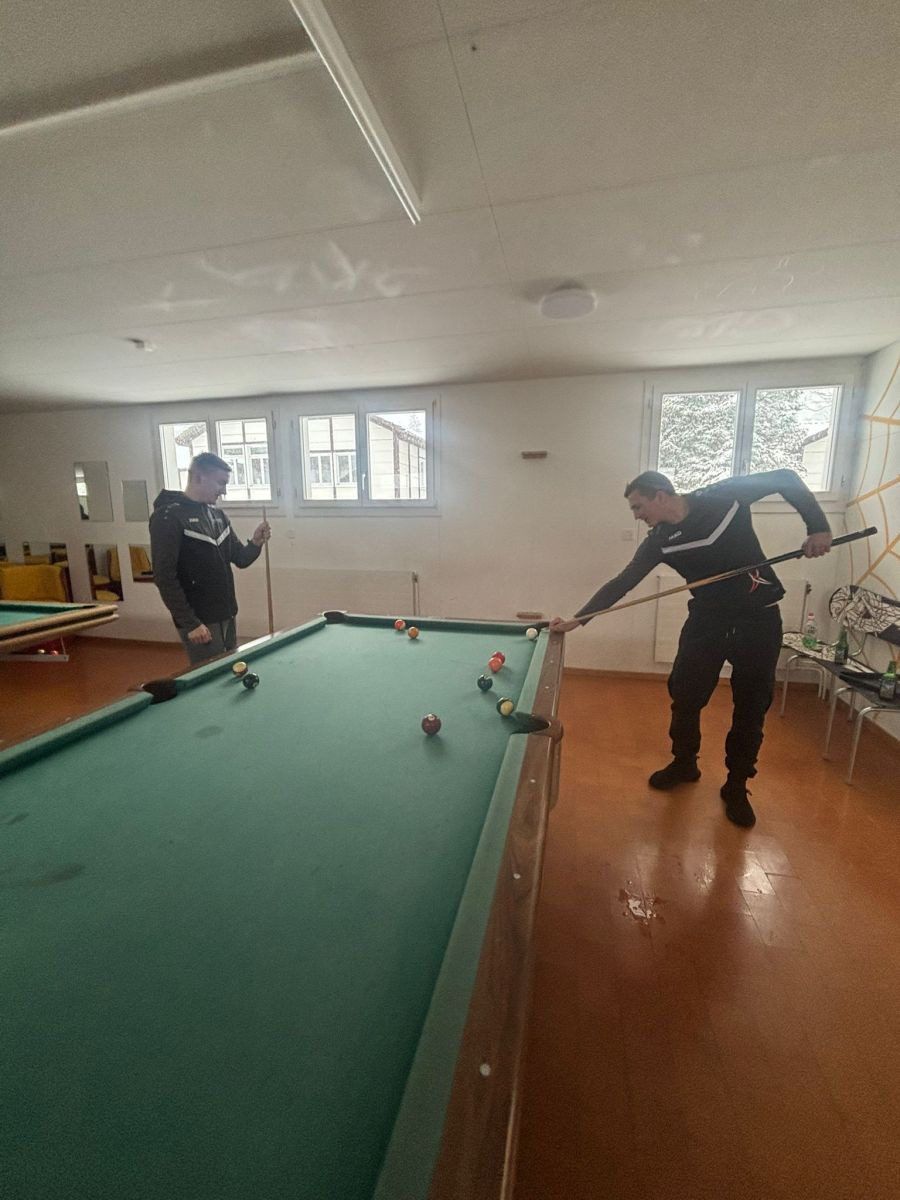 10. Januar: Pünktlich um 7:15 Uhr begann die Abfahrt mit 44 motivierten und dem Wetter trotzenden Turnerinnen und Turnern. Nach einem stärkenden Zwischenstopp mit Gipfeli und Orangensaft wurde bekannt gegeben, dass eine Piste doch offen ist. Die Motiviertesten gingen trotz Schneegestöber auf die Ski. Die Pistenverhältnisse waren den Umständen entsprechend sogar gut, und falls man stürzte, landete man dank des Neuschnees weich. Die gemütlichere Truppe nahm am Alternativprogramm teil. Sie konnte in einer warmen Spielhalle darten, Billard spielen, sich am Töggelikasten behaupten oder eine Runde gemütlich jassen.