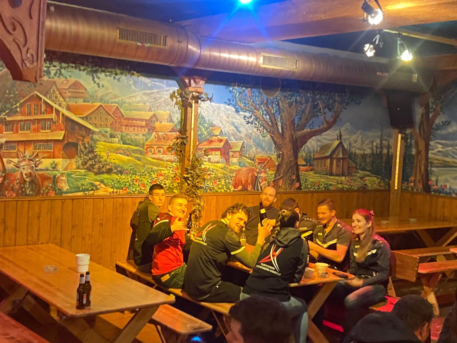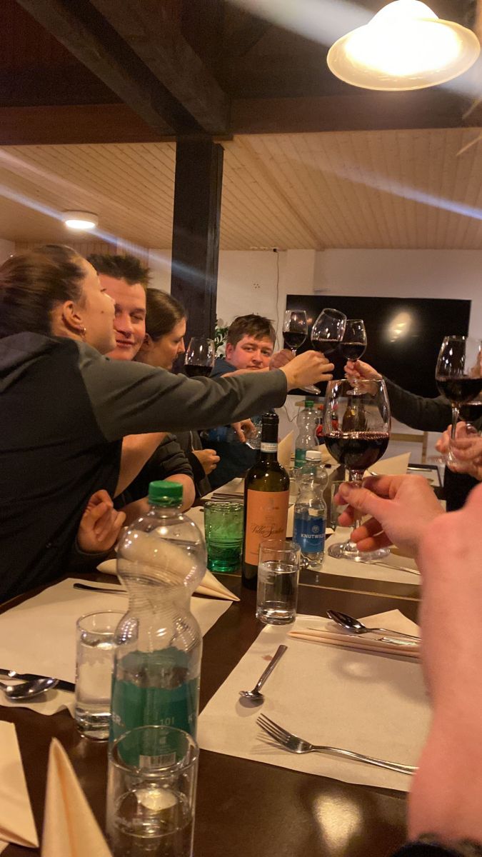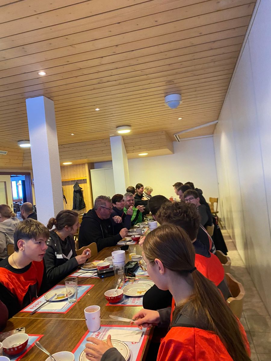 Nach dem Mittagessen konnte man einen kleinen Kulturschock begutachten: Die Fröschli und Holdrio wurden nicht wie sonst in einem Kaffeeglas serviert, sondern in einer Suppenschüssel! Geschmacklich waren sie dennoch sehr fein. Um 16:00 Uhr trafen wir uns alle bei unserer Übernachtungsstätte auf dem Bonistock. Nachdem die Zimmer bezogen worden waren, traf man sich in der Bar, die jedoch noch nicht ganz in Feststimmung war. Dies änderte sich nach dem Abendessen, welches sensationell gut war. Danach war der Haupttreffpunkt wieder an der Bar, jedoch wurde von den üblichen Verdächtigen die Schneebade-Challenge 2026 gestartet. Am Ende des Abends, als alle Willigen ein Schneebad hinter sich hatten, liess man den Abend ausklingen und ging schlafen.